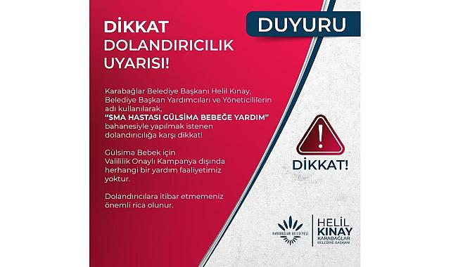 Karabağlar Belediyesi, Karabağlar Belediye Başkanı Helil Kınay, belediye başkan yardımcıları ve yöneticililerin adı kullanılarak, “SMA hastası Gülsima bebeğe yardım” bahanesiyle yapılmak istenen dolandırıcılığa karşı vatandaşları uyardı.