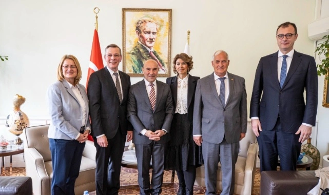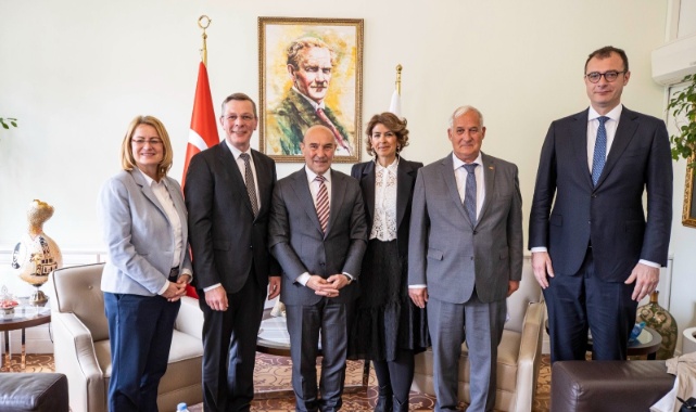 Almanya’nın Bremen Parlamento Başkanı Frank Imhoff ve beraberindeki heyet İzmir Büyükşehir Belediye Başkanı Tunç Soyer’i ziyaret etti. Görüşmede Imhoff, İzmir’de yenilenebilir enerji alanında yatırım yapma düşüncelerini dile getirdi. Başkan Soyer ise yenilenebilir enerji girişimlerine açık olduklarını ifade ederek, kardeş şehir ilişkisinin önemine işaret etti.