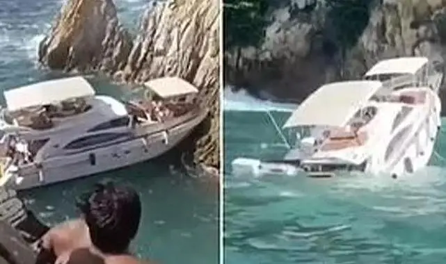 Acapulco'daki La Quebrada açıklarında yaşanan kazanın ardından çekilen görüntülerde, yatın yavaşça sulara gömüldüğü ve parçalarının koparak denize sürüklendiği görülüyor. Tekne neredeyse dikey konuma gelirken, büyük metal parçalar su yüzeyinde yüzüyordu.
