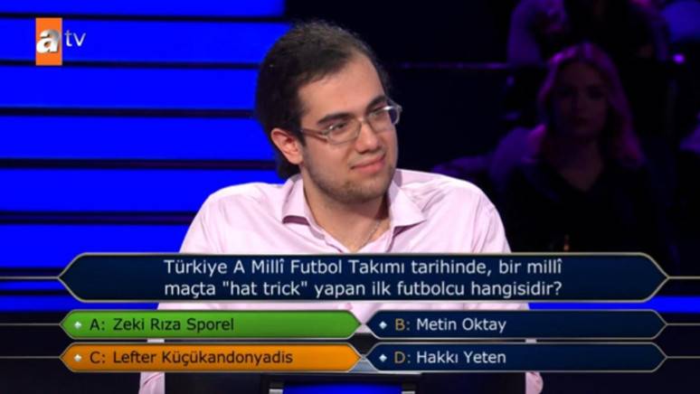 Sevim’in karşısına çıkan 1 milyonluk soruda, Türkiye A Millî Futbol Takımı tarihinde bir maçta hat-trick yapan ilk futbolcu soruldu. Karar anında emin olamayan yarışmacı, risk almamak adına yarışmadan çekilmeyi tercih etti.