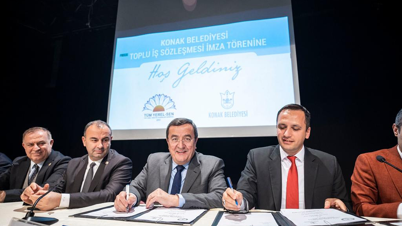 Konak Belediyesi memur ve işçilerini kapsayan toplu iş sözleşmelerinin imza törenleri art arda yapıldı. Konak Belediyesi ve Tüm Yerel-Sen İzmir 2 No’lu Şube arasındaki toplu iş sözleşmesi imza töreni Selahattin Akçiçek Kültür Merkezi’nde gerçekleştirildi. Törene Konak Belediye Başkanı Abdül Batur’la birlikte CHP Parti Meclisi Üyesi ve İstanbul Milletvekili Gökan Zeybek, CHP Parti Meclisi Üyesi ve İzmir Milletvekili Ednan Arslan, CHP İzmir İl Başkan Vekili Münir Sirhan Özel ve il yöneticileri, CHP Konak İlçe Başkanı Akın Küçükoğullarından ve yönetimi, Tüm Yerel-Sen kurucu Başkanı Vicdan Baykara, Tüm Yerel-Sen Genel Sosyal ve Dış İlişkiler Sekreteri Tamer Yiğit Güler, Tüm Yerel-Sen İzmir 2 No’lu Şube Başkanı Ömer Eşki ve yönetim kurulu üyeleri, Tüm Yerel-Sen İzmir 1 No’lu Şube Başkanı Yücel Yılbaşı, Tüm Yerel-Sen işyeri temsilcileri, Konak Belediyesi Meclis Üyeleri, belediye bürokratları ve belediye memurları katıldı. Şenlik havasında gerçekleşen törenin ardından Konak Belediyesi ile DİSK’e bağlı Genel-İş İzmir 5 No’lu Şube arasındaki toplu iş sözleşmesi imza töreni için hep birlikte belediyenin Gürçeşme’deki Temizlik İşleri Müdürlüğü şantiyesine geçildi. Belediye işçilerinin halaylar çektiği törene DİSK Genel-İş Sendikası Genel Başkanı Remzi Çalışkan, Genel-İş Sendikası Genel Sekreteri Şükret Sevgener, Genel-İş Toplu Sözleşmeler Daire Başkanı Çetin Çalışkan, Genel-İş Sendikası Örgütlenme Daire Başkanı Ali Haydar Kara, DİSK Ege Bölge Temsilcisi Memiş Sarı, Sosyal Demokrat Kamu İşverenleri Sendikası (Sodemsen) Genel Sekreteri Cahit Korkmaz, Genel-İş 5 No’lu Şube Başkanı Ahmet Savaş Aras ve 1,2,3,4,6,7,8 ve 9 No’lu şubelerin başkanları, Genel-İş 5 No’lu Şubeye bağlı Konak, Karabağlar, Buca ve Gaziemir Belediyeleri işyeri temsilcileri ve belediye işçileri katıldı.