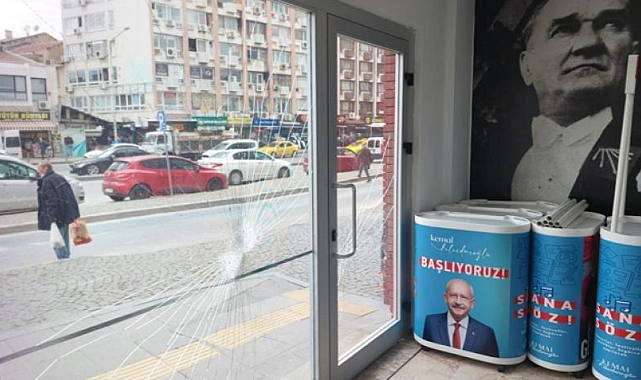 İzmir’in Konak ilçesinde CHP’nin 13. Cumhurbaşkanı adayı Kemal Kılıçdaroğlu’nun seçim çalışmalarının yürütüleceği seçim ofisine taşlı saldırı düzenlendi. Saldırgan, “Herkes AK Parti’ye oy verecek” diyerek polise teslim oldu.