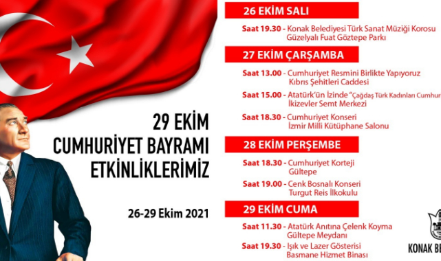 Konak Belediyesi, Türkiye Cumhuriyeti’nin 98’inci kuruluş yıldönümünü 7’den 70’e tüm vatandaşların katılacağı etkinliklerle kutluyor. Cumhuriyet Bayramı coşkusu Konak’ta, parklardan semt merkezlerine, sokaklardan meydanlara, ilçenin her noktasında doyasıya yaşanacak.