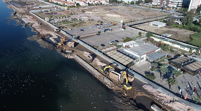 Peynircioğlu Deresi yakınındaki Deniz Kent Restoran önünden başlayıp kuzeye doğru Mavi Ada bölgesini de içine alan 2 kilometrelik sahil hattında Fen İşleri Daire Başkanlığı tarafından yürütülen Kıyı Rehabilitasyon Projesi çalışmaları hakkında bilgi veren İzmir Büyükşehir Belediyesi Genel Sekreter Yardımcısı Eser Atak, “Sahil bölgesinde hem deniz suyu kabarmasıyla meydana gelebilecek taşkını hem de zemin altından deniz suyu geçişini engellemek için yerin 4 metre altında yapımına başladığımız 2 bin 88 metrelik su içi betonunun 620 metresini tamamladık. Ön kısımda yeniden imal edilecek kaya tahkimatın da kazısına başladık. Bu proje sadece bugünü kurtarmaya yönelik hazırlanmadı, küresel ısınmadan dolayı deniz seviyesi yükseliyor. Buranın geleceğine yönelik de bir sorun büyük ölçüde çözülmüş olacak” diye konuştu.