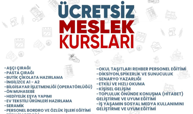 Herhangi bir meslek sahibi olmayan kişiler, proje kapsamında katıldıkları kurslarda ücretsiz eğitim alabilecek. Kursları başarıyla tamamlayanlara geçerliliği olan sertifikalar verilecek. Meslek Fabrikası’nın Narlıdere Şubesi’nde, ‘Aşçı Çırağı’, ‘Bilgisayar İşletmenliği (Operatörlüğü)’, ‘Butik Çikolata Hazırlama’, ‘Ev Tekstili Ürünleri Hazırlama’, ‘İngilizce A1 ve A2 Seviyesi’, ‘Ön Muhasebe’, ‘Pastacı Çırağı’, ‘Personel Bordro ve Özlük İşleri Eğitimi’, ‘Seramik’, ‘Turistik ve Hediyelik Eşya Yapımı’, ‘Türk İşaret Dili’, ‘Diksiyon, Spikerlik ve Sunuculuk’, ‘Okul Taşıtları Rehber Personel Eğitimi’, ‘Senaryo Yazarlığı’, ‘Etkili ve Hızlı Okuma’, ‘Kişisel Gelişim’, ‘Topluluk Önünde Konuşma (Hitabet) Geliştirme ve Uyum Eğitimi’, ‘İş Yaşamında Sosyal Medya Kullanımı Geliştirme ve Uyum Eğitimi’ kursları verilecek. Katılmak isteyenler, kimlik ve diploma fotokopisi ile kurslara başvuru yapabilecek.