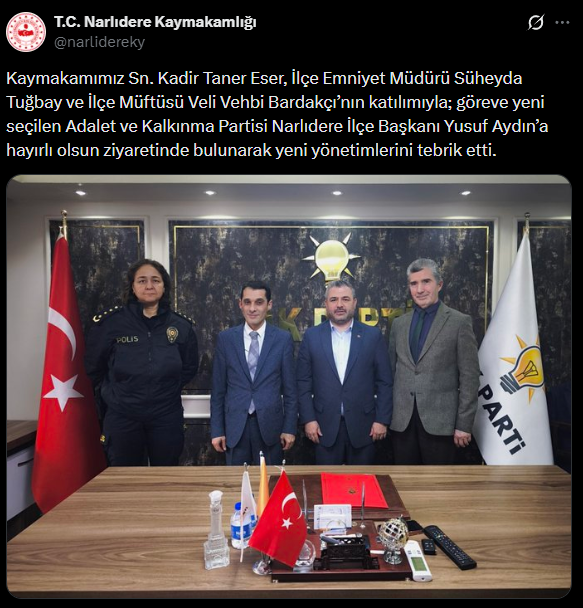 Ziyaret, Narlıdere Kaymakamlığı’nın resmi sosyal medya hesabından paylaşıldı. Yapılan açıklamada, “Kaymakamımız Sn. Kadir Taner Eser, İlçe Emniyet Müdürü Süheyda Tuğbay ve İlçe Müftüsü Veli Vehbi Bardakçı’nın katılımıyla; göreve yeni seçilen Adalet ve Kalkınma Partisi Narlıdere İlçe Başkanı Yusuf Aydın’a hayırlı olsun ziyaretinde bulunarak yeni yönetimlerini tebrik etti” ifadelerine yer verildi.