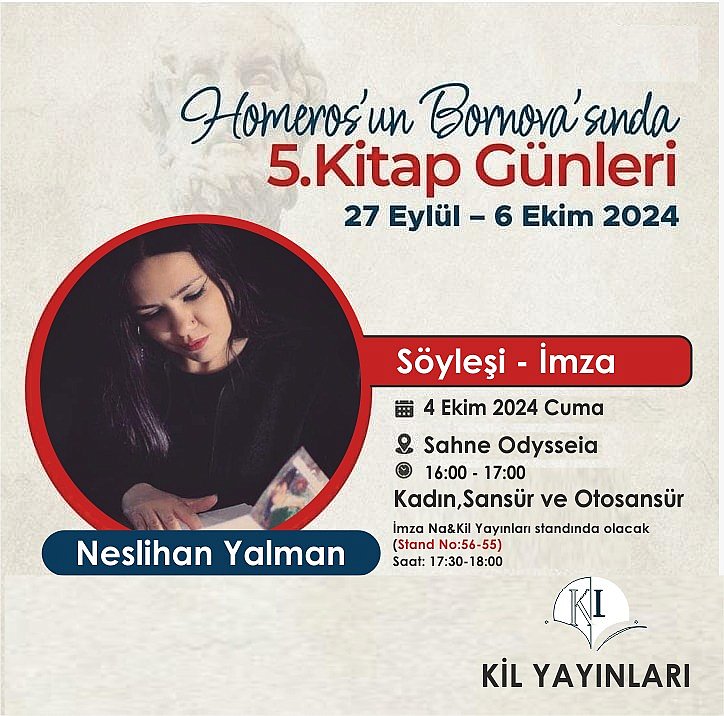 4 Ekim 2024- cuma günü saat 16:00'da Neslihan Yalman "Kadın, Sansür Ve Otosansür" konulu bir konuşma yapacak. Daha sonra da kitaplarını imzalayacak.