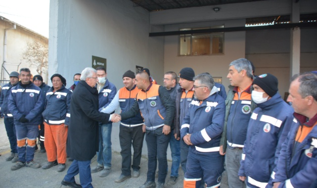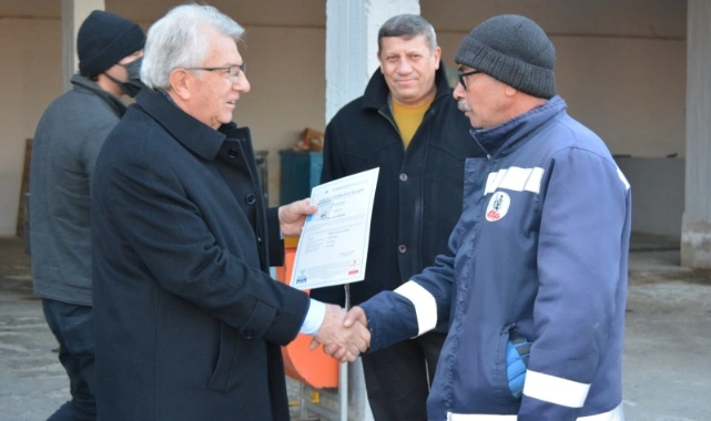 Ödemiş Belediye Başkanı Mehmet Eriş, Temizlik İşleri Müdürlüğü şantiyesinde düzenlenen törende mesleki yeterlilik belgelerini belediye çalışanlarına teslim etti.