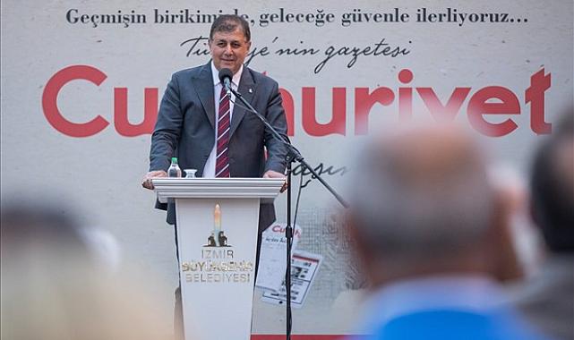 Etkinlikte konuşan İzmir Büyükşehir Belediye Başkanı Dr. Cemil Tugay, “Dünyada kaç tane gazete 100 yaşına varabilmiştir? Daha önemlisi 100 yıllık süreç içinde çizgisinden adeta bir santimetre bile sapmadan savunduğu yüce değere böylesine sahip çıkabilmiştir, bilmiyorum. Cumhuriyet denince bizim aklımıza haince, affedilmez bir şekilde katledilmiş o değerli, güzel insanlar gelir. Dün Genel Başkanımız ‘Cumhuriyet’in şehitleri’ demiş. Aynı ifadeyi ben de kullanmak isterim. Gerçekten aklımıza hepimizin şehitleri olan o güzel insanlar gelir. Her birisini üzüntüyle, acıyla ama bir o kadar da onur ve saygıyla hatırlıyoruz. Bugün biraz özgürlüğümüz, demokrasimiz, halen laikliğimiz, halen geleceğe dair umudumuz varsa onlar ve onlar gibi insanların eseridir. Hakları asla ödenmez. Bir diğer tarafta da şöyle insanlar geliyor aklıma; Cumhuriyet Gazetesi’ni katlayıp koltuğunun altına koyan, onu bütün gün gezdiren, sadece kendisi okumakla kalmayıp başkalarına da okutan o güzel, değerli insanlar. Muhtemelen onlar buradalar” dedi.
