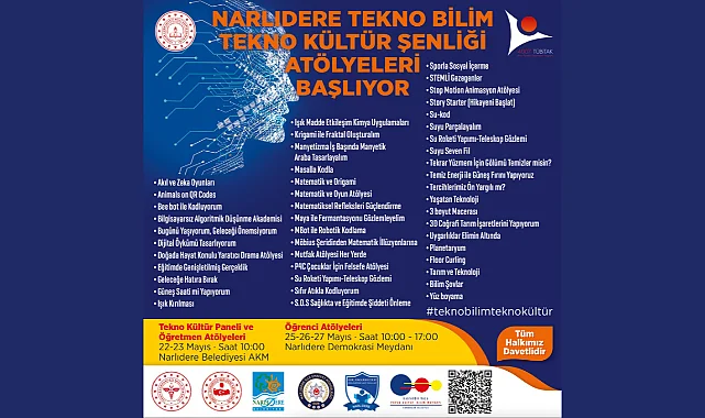 Narlıdere'de 22-27 Mayıs tarihlerinde gerçekleştirilecek olan Tekno Bilim Tekno Kültür Şenliği'nde teknoloji ve bilim rüzgarı hem çocuklar hem de öğretmenler için esecek. Öğretmen atölyeleriyle başlayan şenlik, birbirinden eğlenceli 43 atölyeyle 25-26-27 Mayıs tarihinde tüm halka ve öğrencilere açık olacak. Narlıdere Demokrasi Meydanı'nda gerçekleşecek etkinlikte katılım ücretsiz olacak.