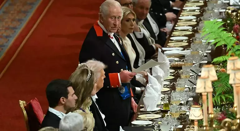 Kraliçe Camilla, safir taşlı tiarası ve mavi elbisesiyle göz kamaştırırken Melania Trump omuz dekolteli sarı elbisesiyle davetin en şık isimleri arasında yer aldı. Diplomasi kadar zarafetin de öne çıktığı gece, hem görsel ihtişam hem de liderlerin açıklamalarıyla gündeme oturdu.