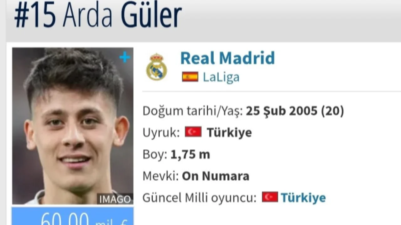 Real Madrid’de forma giyen milli futbolcu Arda Güler’in piyasa değeri kısa sürede 45 milyon eurodan 60 milyon euroya yükseldi. Bu artışla birlikte Arda, Türk futbol tarihinin en değerli isimlerinden biri haline geldi.