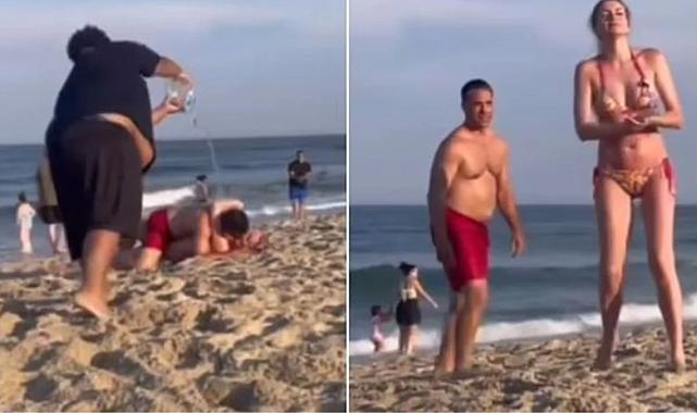 Amerika'da bir plajda yaşanan olay, sosyal medyada büyük yankı uyandırdı. Bir genç, aşırı samimi davranışlar sergileyen bir çifte su şişesi fırlatınca kavga çıktı.