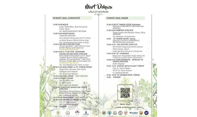 olduğu Mart Dokuzu Urla Ot Bayramı, katılımcılara zengin, deneyimsel, öğretici ve eğlenceli bir program sunuyor. Yenilebilir Urla otlarının ve Urla otlarıyla yapılan yöresel yemeklerin satıldığı stantlar, Ot Bayramı’nın gerçekleşeceği her iki gün de açık olacak. Ot bayramı, tarihi ve kültürel gezilere, atölyelere, söyleşilere, kır gezisi ve otları tanıma etkinliklerine, çocuklar için aktivitelere, yarışmalara, sergilere, konser ve halk oyunlarına sahne olacak.