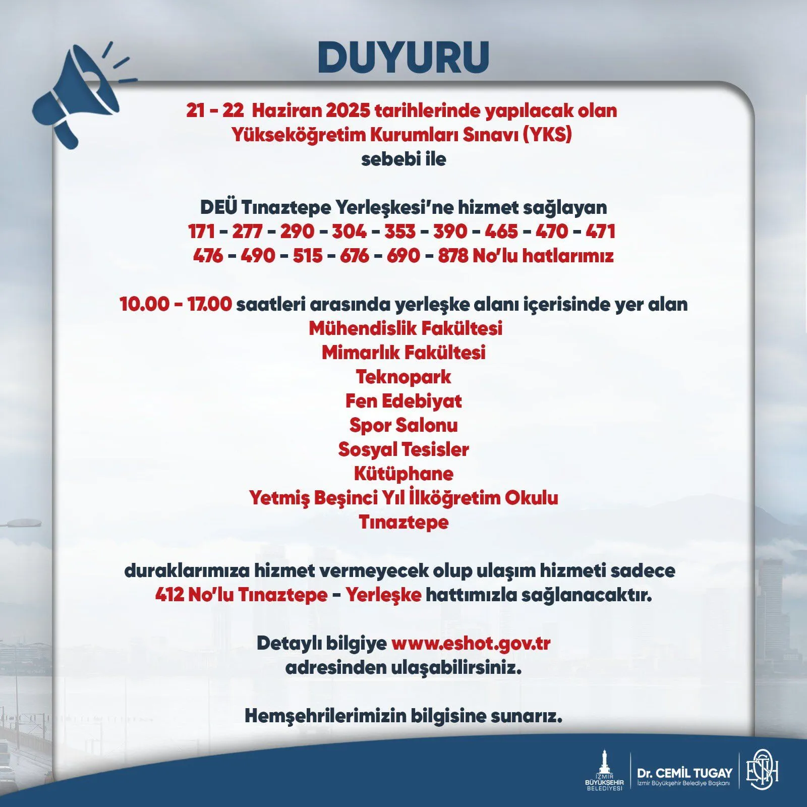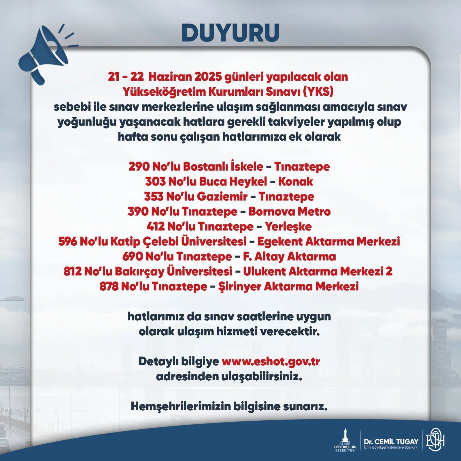 İzmir Büyükşehir Belediyesi ESHOT Genel Müdürlüğü, 21-22 Haziran 2025 tarihlerinde yapılacak Yükseköğretim Kurumları Sınavı (YKS) kapsamında toplu ulaşımda düzenlemeye gitti. Sınav günlerinde adayların sınav merkezlerine sorunsuz ulaşım sağlayabilmesi amacıyla bazı hatlarda ek seferler konulacak.