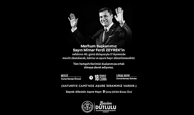 Manisa Büyükşehir Belediyesi, geçtiğimiz haftalarda hayatını kaybeden Belediye Başkanı Ferdi Zeyrek’i vefatının 40. gününde dualarla anacak. 18 Temmuz Cuma günü Manisa’nın 17 ilçesinde eş zamanlı olarak mevlit okutulacak, ardından aşure ve lokma hayrı yapılacak.